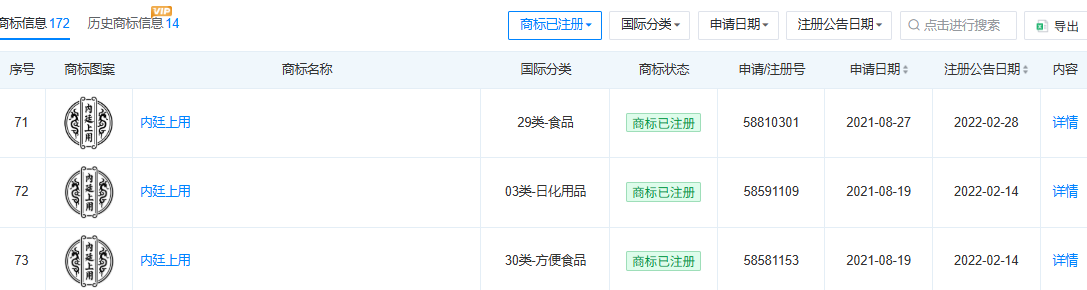 红星成本局在天眼稽查到,北京同仁堂兴安保健、北京同仁堂(四川)药业此前在食物、告白销售等多个外洋分类下齐分别注册了“内廷上用”“朕皇”的关联商标。这两家公司还分别就“内廷上用”“朕皇”关联商标在便捷食物、医药等外洋分类下央求注册,现在在恭候本色审查阶段。