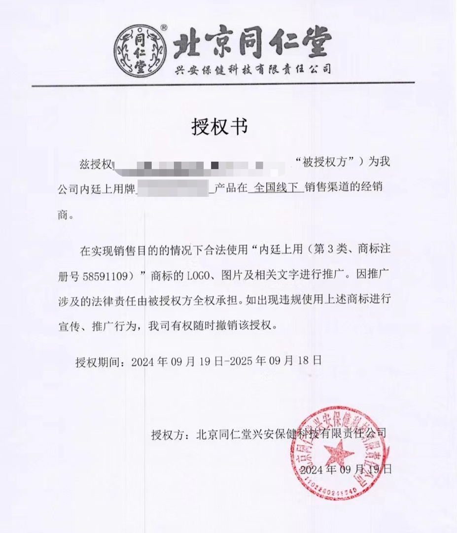 当被问及这类授权的委果性时,广东地区别称招商东说念主员出示了一份北京同仁堂兴安保健授权某公司就“内廷上用牌xx膏”在寰宇线下渠说念进行销售的授权书。授权书涌现,可在杀青销售场地的情况下正当使用“内廷上用(第3类、商标注册号58591109)”商标的LOGO、图片及关联翰墨进行实施。